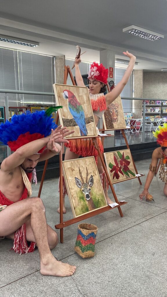 Depois, os bailarinos caminharam pelas laterais do auditório, ainda no piso superior, e acabaram descendo ao palco no primeiro piso, reproduzindo as danças típicas indígenas e sua exploração do habitat. Ao final, o grupo percorreu o interior da plateia com passos tão rápidos e articulados, que não permitia se fixar o olhar em nenhum deles, o que envolveu os presentes. A apresentação terminou com os bailarinos percorrendo a exposição de quadros da artista plástica Gica Barbosa, montada no fundo do auditório.