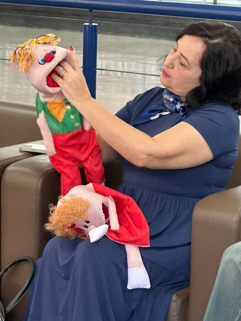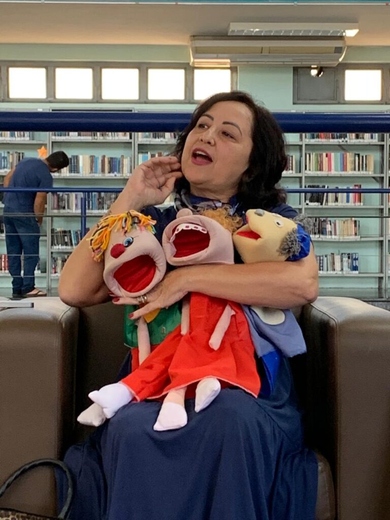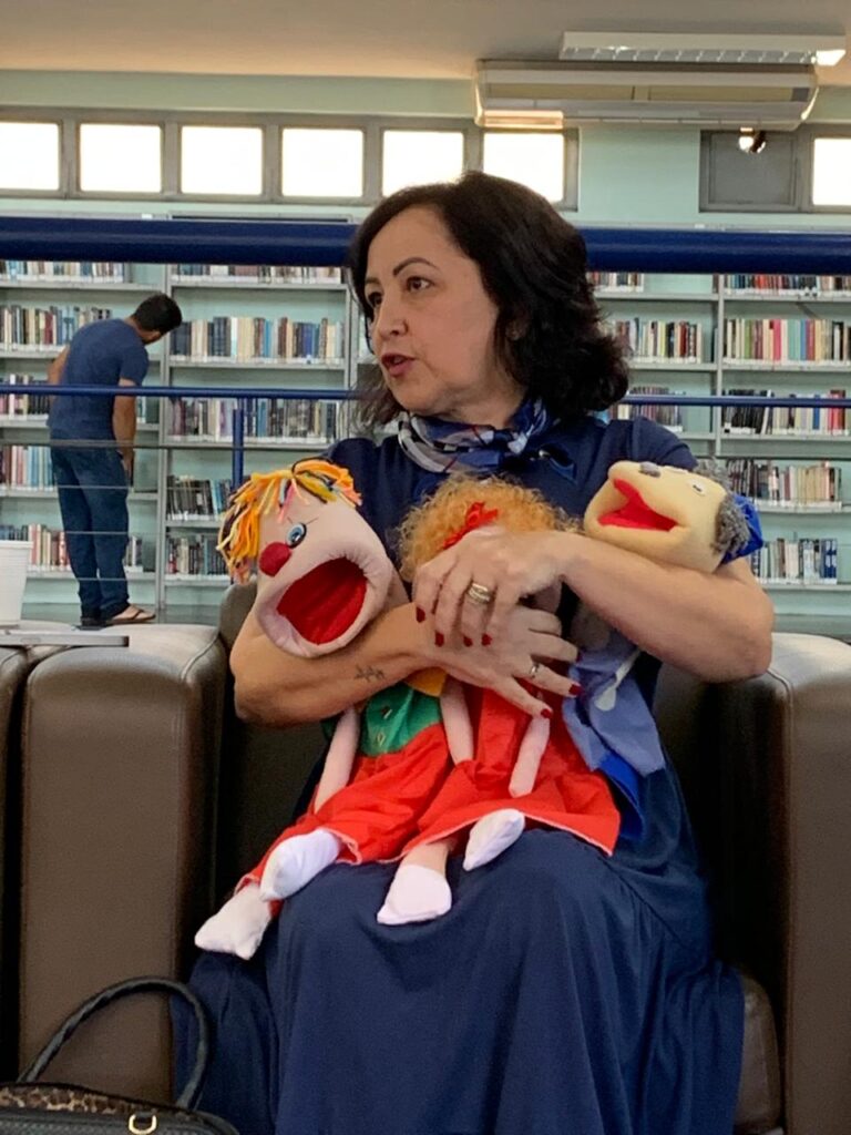 A escritora fez uma apresentação com os bonecos que usa nas escolas: Juju, o Palhaço Torresmo e Zezinho