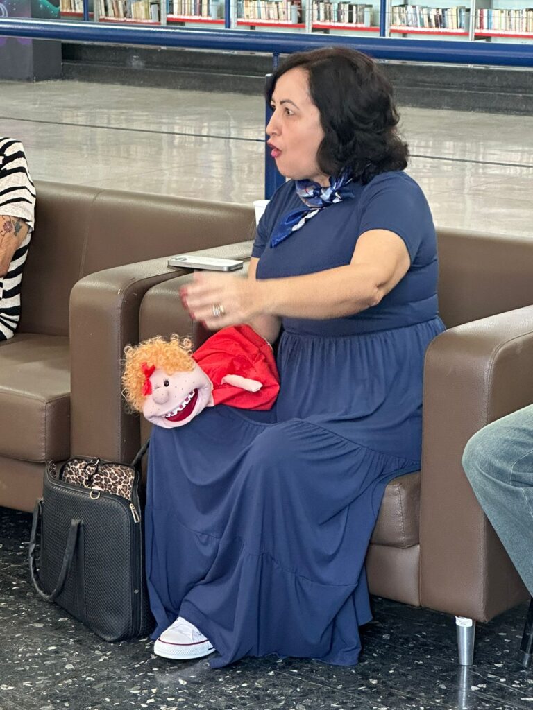 Cynara revelou que desenvolveu uma abordagem única para engajar os pequenos leitores, que é feita a partir da manipulação de bonecos de pano, e apresentou um trio que usa nas suas apresentações: a Juju, o palhaço Torresmo e o Zezinho.