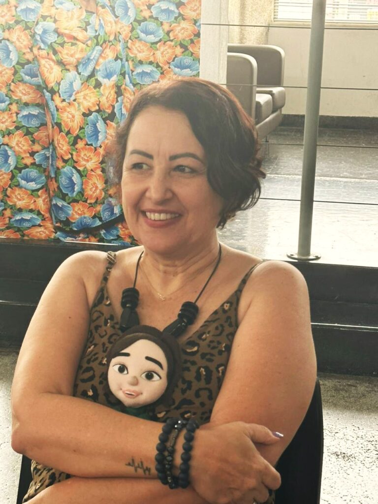 A escritora Cynara Lenzi Veronezi com uma das bonecas que usa nas suas palestras
