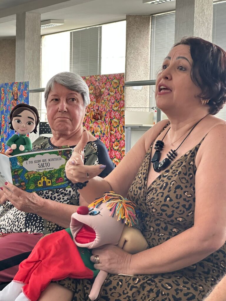 Cynara segura um dos bonecos e a escritora Cristina Maria Salvador um dos livros dela