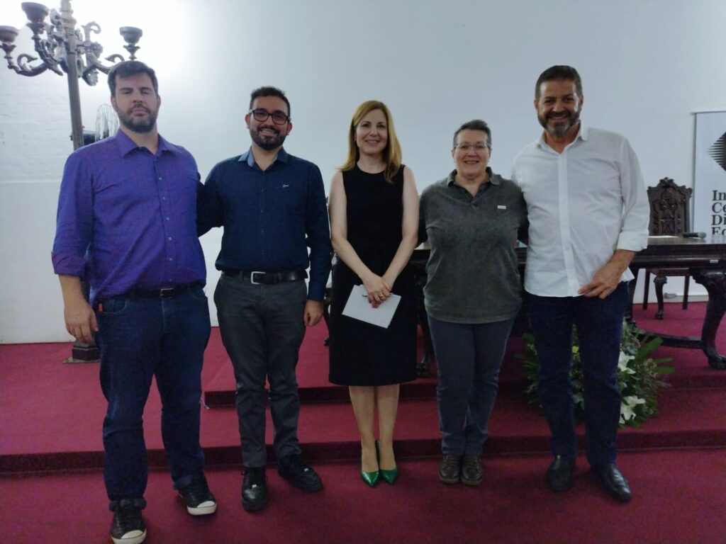 Os jornalistas Rodrigo Augusto Tomba e Eloy Oliveira, a mediadora Mirna Bicalho, a jornalista Rose Ferrari e o radialista Henrique da Silva Pereira